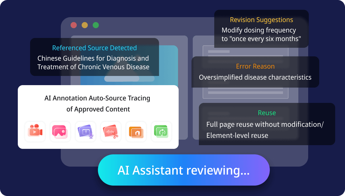 Based on MeDomino's powerful content tracing capabilities, fully automated content breakdown, detection, and approval, comparing with existing knowledge base information, generating detailed content review evidence, requiring no manual intervention; All you need to do is input the content!